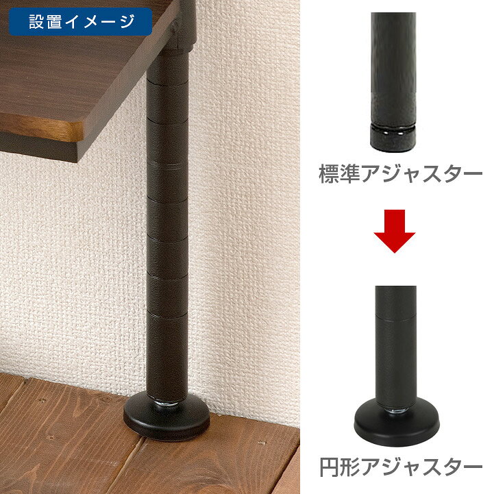 ラックの移動に便利なキャスターや、安定性がアップする三角プレート脚、円形アジャスターがあります。