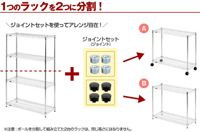 内容明細 キャップ×4個キャスター受け×4個 材質 キャップ:ポリエチレンキャスター受け:スチール(亜鉛メッキ) その他 ポールを分割して組み立てた2台のラックは、同じ高さにはなりません。